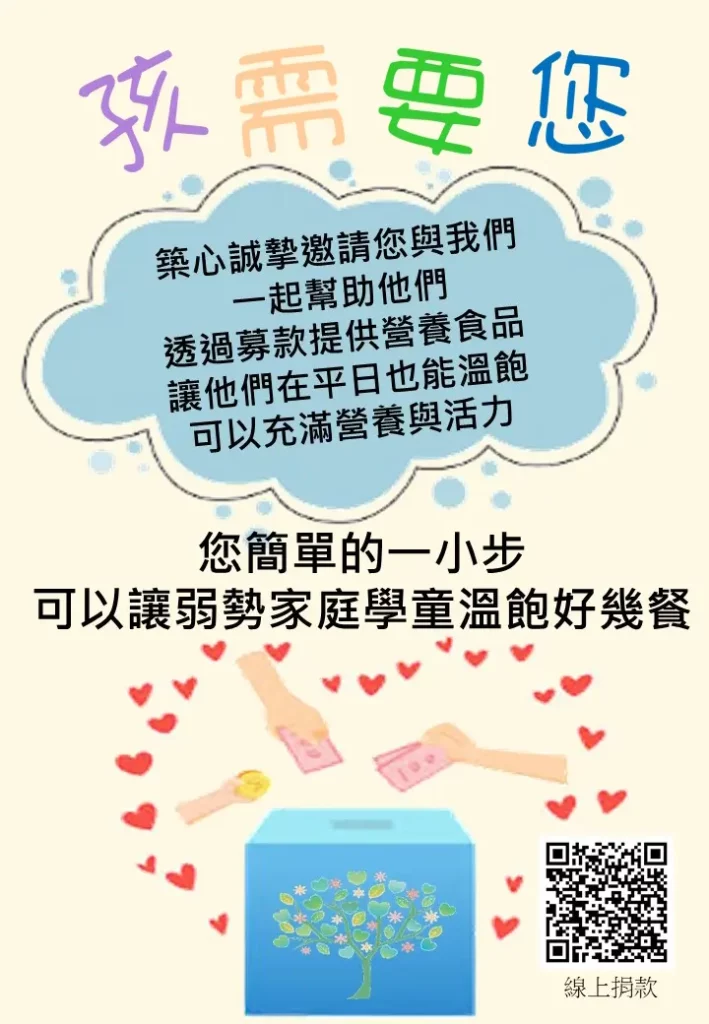 為了讓弱勢家庭學童不挨餓,築心之家誠摯邀請您與我們一起幫助他們,透過募款提供營養食品讓他們在平日也能溫飽!