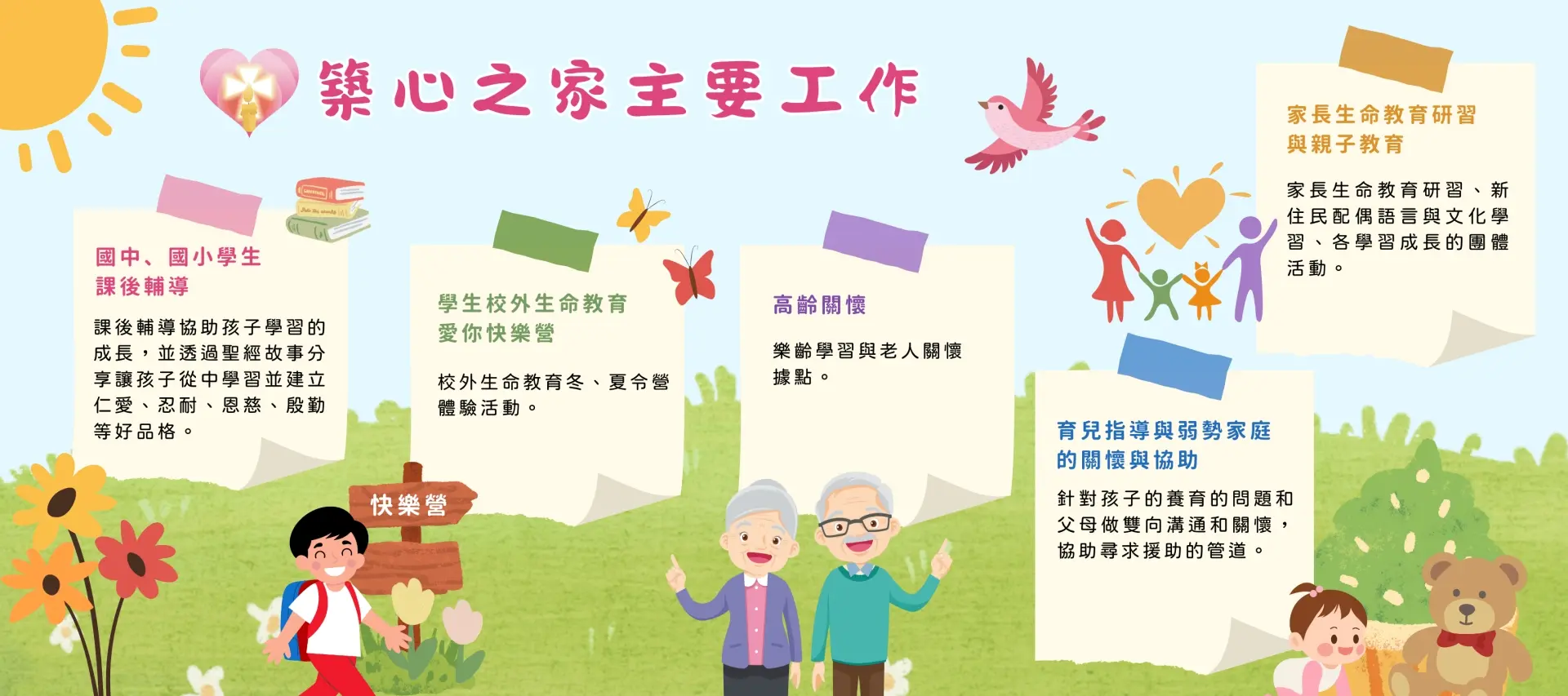 成立初始以兒童與青少年的「築苗夜光天使點燈陪讀計畫」為主,後由課後陪讀轉型為「築苗課後照顧計畫」;2017年更從兒少服務到高齡長者社區關懷之專業全方位的社會福利服務,2023年繼而承接新竹縣育兒指導服務方案,提供 0-6 歲到宅育兒指導。落實全齡、全人(身、心、靈)的關懷服務。